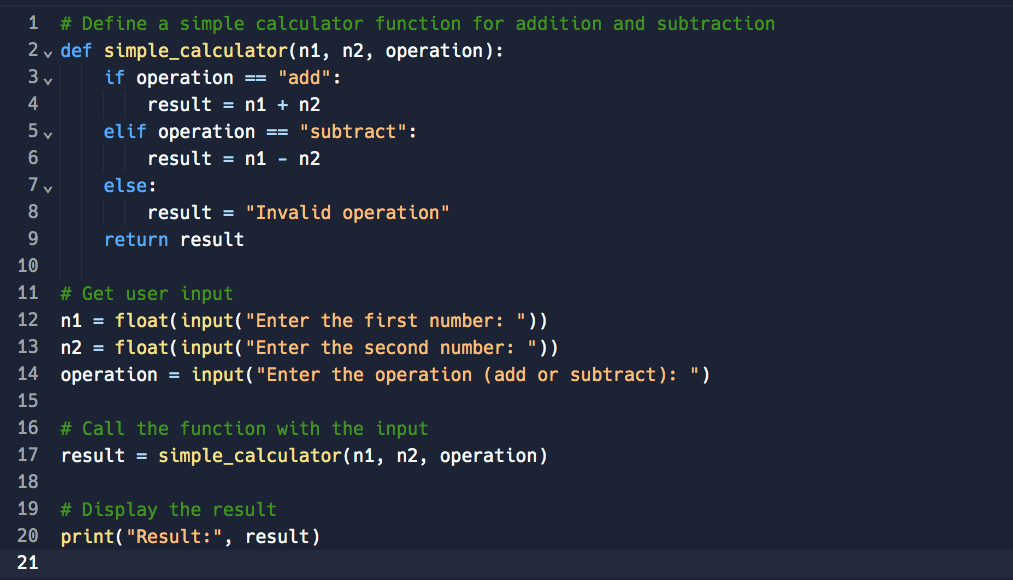 Let’s explore a basic Python calculator for addition and subtraction: